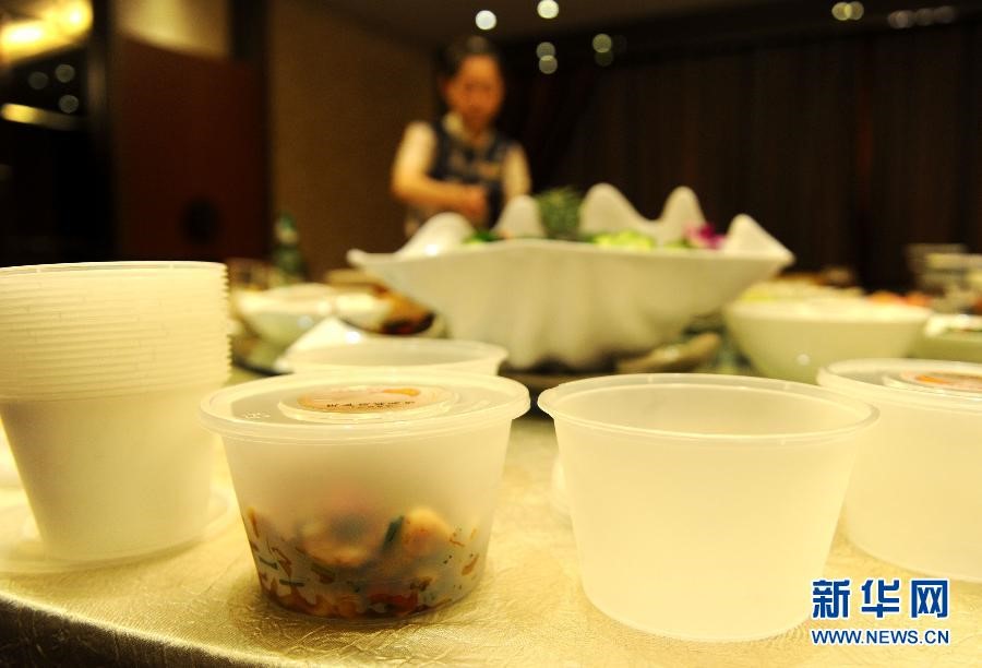 服务人员在用塑料餐具为顾客打包食品 (图片来源:刘军喜/新华社)