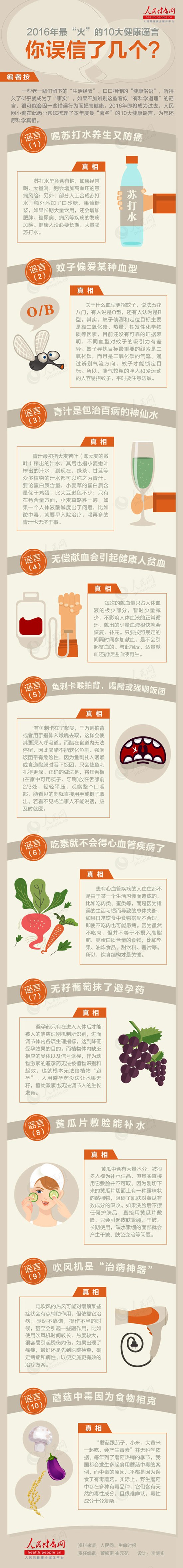 编者按:一些老一辈们留下的“生活经验”、口口相传的“健康俗语”,听得久了似乎就成为了“事实”。如果不加辨别这些看似“有科学道理”的谣言,很可能会因一些错误行为而损害健康。2016年即将成为过去,人民网小编在此悉心帮您梳理了本年度最“著名”的10大健康谣言,为您还原科学真相。