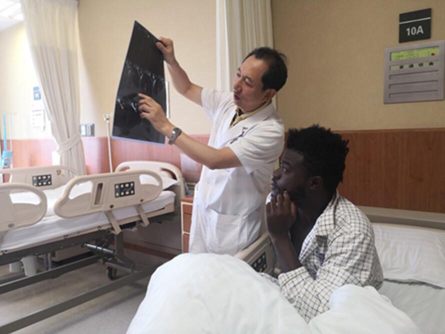 国庆节期间,北京清华长庚医院神经外科科主任王贵怀正在为一名来中国学医的非洲小伙进行颈部脊髓内肿瘤切除手术的术前查房。身为医护人员,节假日对他们来说既特殊又平常。“在新中国成立70周年之际,我们更要坚守岗位,守护好千家万户的健康!”王贵怀说。(北京清华长庚医院供图)