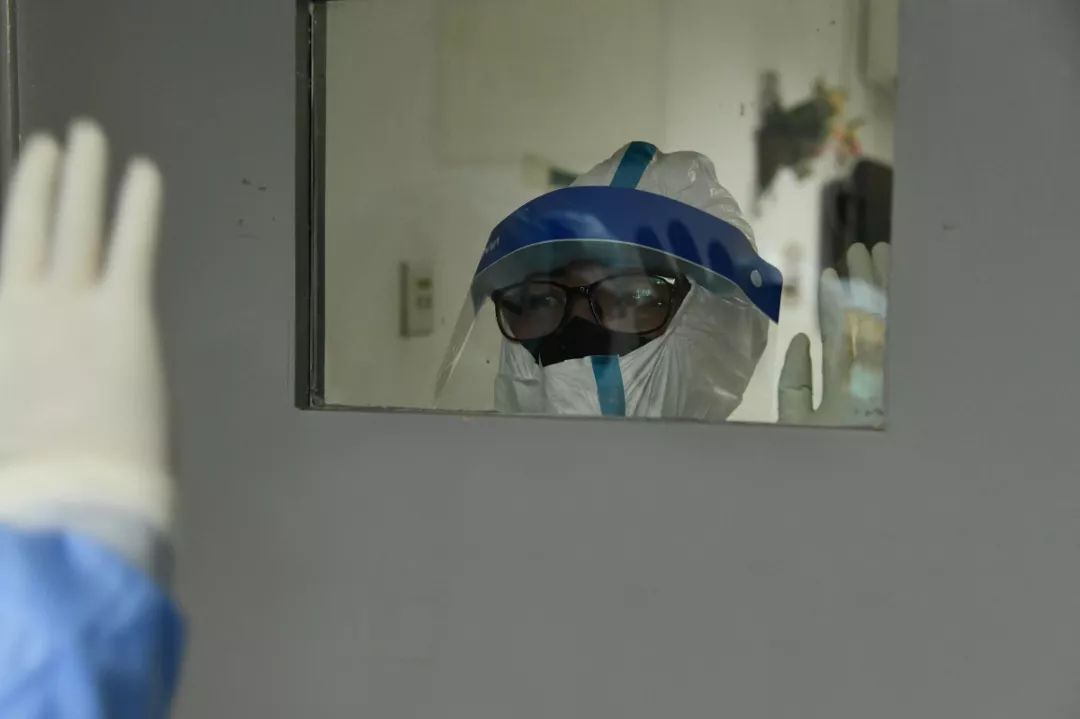 隔离病房的医务人员问候、鼓劲。他们在听到患者的呼救后,第一时间冲上了防治工作的一线。密不透风的隔离衣,每天一穿就是500余分钟。可他们依然毫无怨言,只因患者的需要、患者家人的期盼,只因他们肩上有着沉甸甸的两个字——“医生”。(华中科技大学附属协和医院供图)