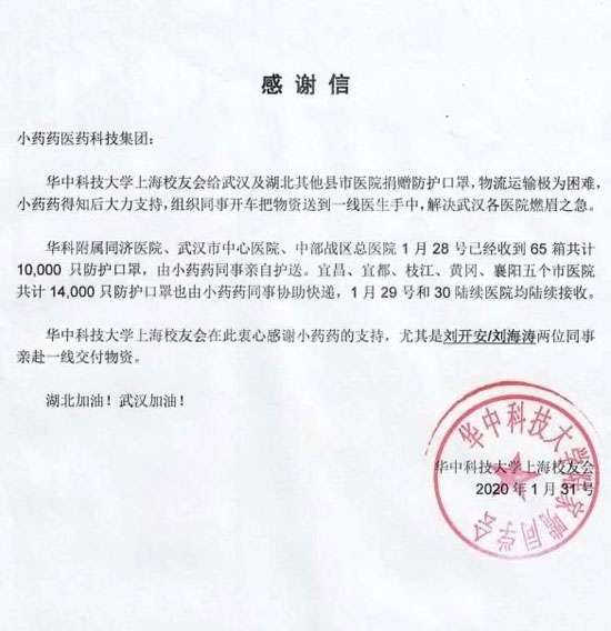 华中科技大学上海校友会给小药药员工的感谢信