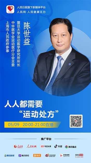 5月9日20:00-21:00,复旦大学运动医学研究所所长、中华医学会运动医疗分会主委陈世益教授将做客“人民好医生”直播间,带你了解运动医学的魅力,为您的健康保驾护航!