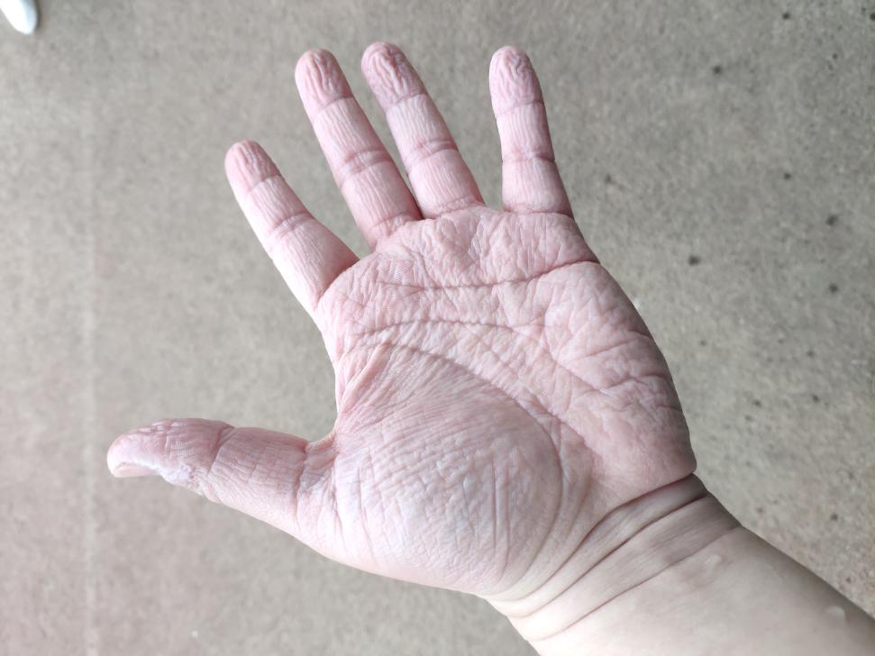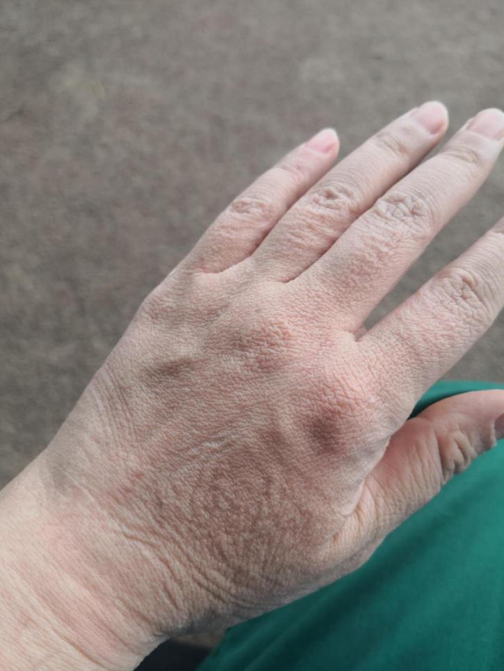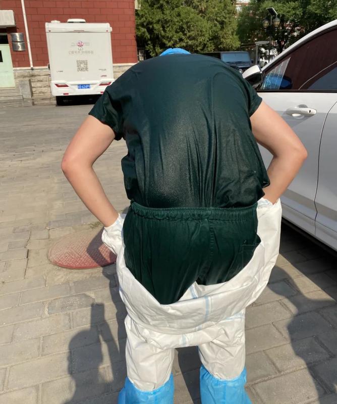 在丰台区的核酸检测采样点,北京中医药大学东方医院的医护,脱下穿了3个小时的防护服,他们的手掌被汗水浸泡出了褶皱、有的正在脱皮。