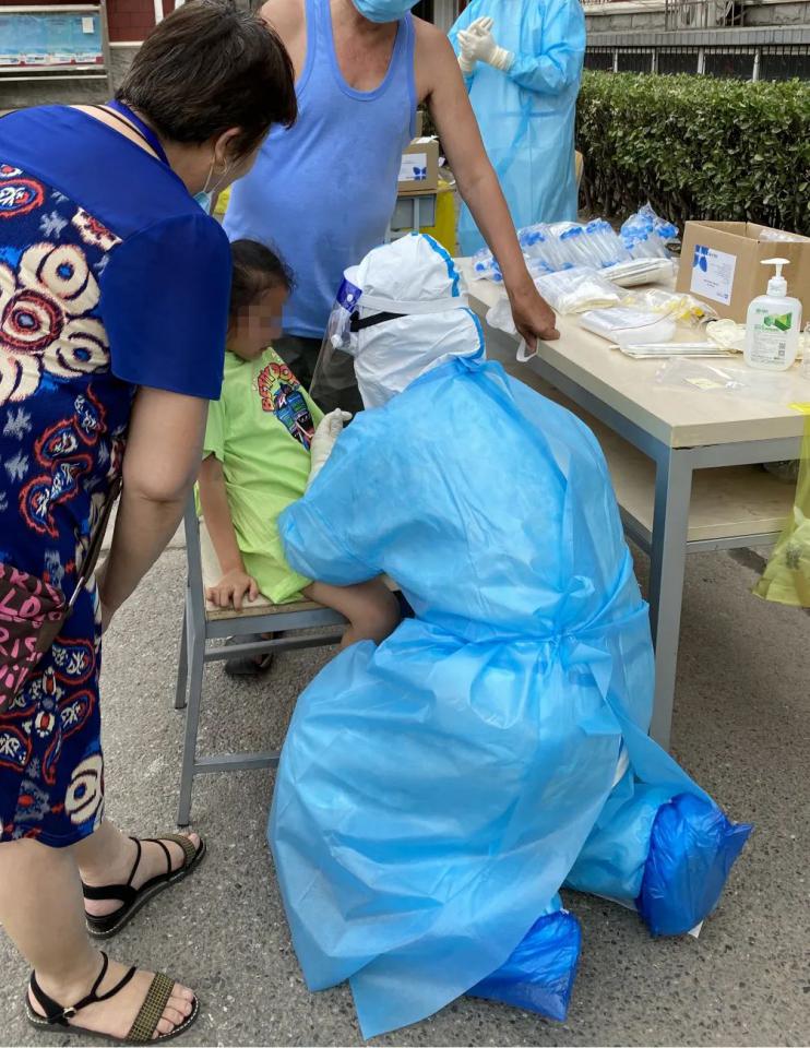 6月21日下午,北京市丰台区马家堡社区核酸集中采集点。天气预报显示气温36摄氏度,高温预警。身穿全套防护服跪在地上的是北京天坛医院手术室护士金晨。来做检测的小姑娘看起来有些紧张,因为身高的原因,医护人员站着采样的常规操作方式也不容易操作。为了让小家伙放松,同时确保操作更方便,金晨笨拙地跪在地上,跟她面对面地交流。几秒钟的时间,采样顺利完成,脸上还挂着泪珠的小姑娘笑了起来。