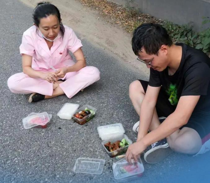 6月16日傍晚,桥梓镇社区卫生服务中心医务人员协助泉河社区加班采样,忙碌了一天的王浩宇、李楠席地而坐,简单地吃一点已经凉了的饭菜。