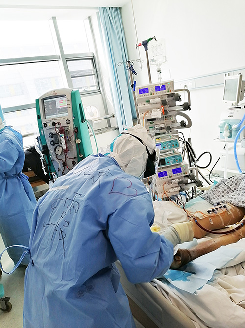 “当时患者身上有15个微量泵,应用着PICCO监测、动脉血压监测、ECMO治疗、呼吸机控制呼吸、BIS监测等,全身上下布满胃管、尿管、空肠营养管,患者的严重程度超出想象。不定时吸痰、各种监测记录、管道护理、鼻饲营养供给……这给同去的医疗队员造成了极大的心理压力。”回忆起唐山新冠肺炎危重患者的救治场景,田晓华仍历历在目。“只要我们在一天,哪怕再苦再难也不能放弃。”田晓华多次给护理人员做心理疏导、打气加油。