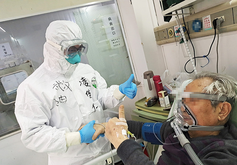 凌传仁穿着防护服在武汉跟新冠肺炎病人相互鼓励点赞。受访者供图